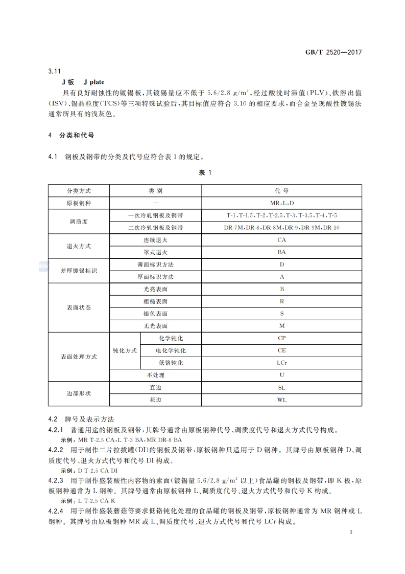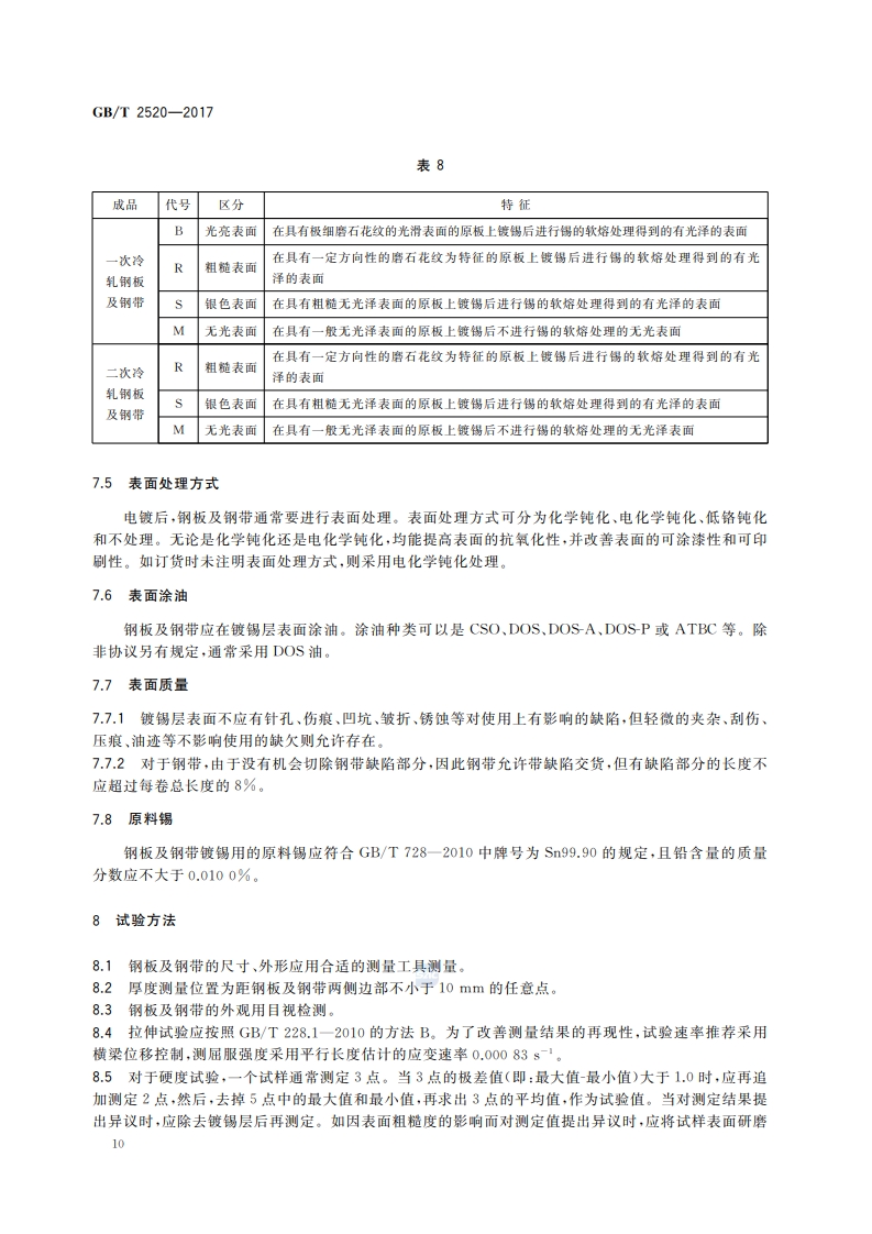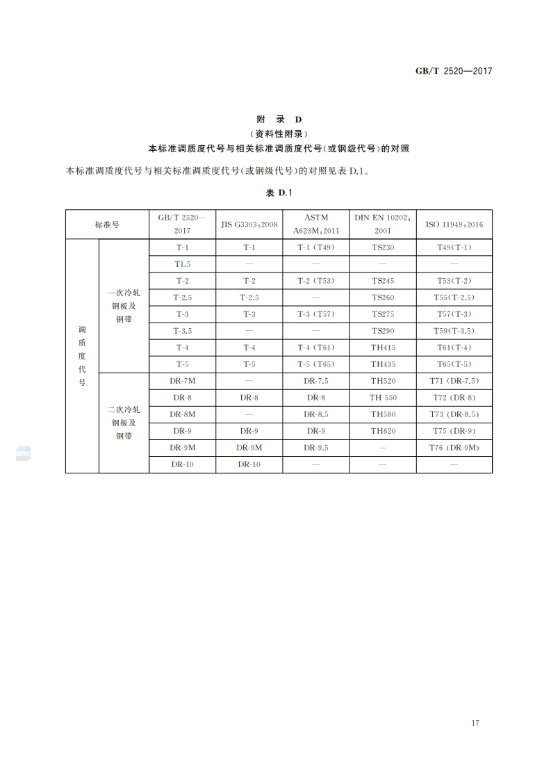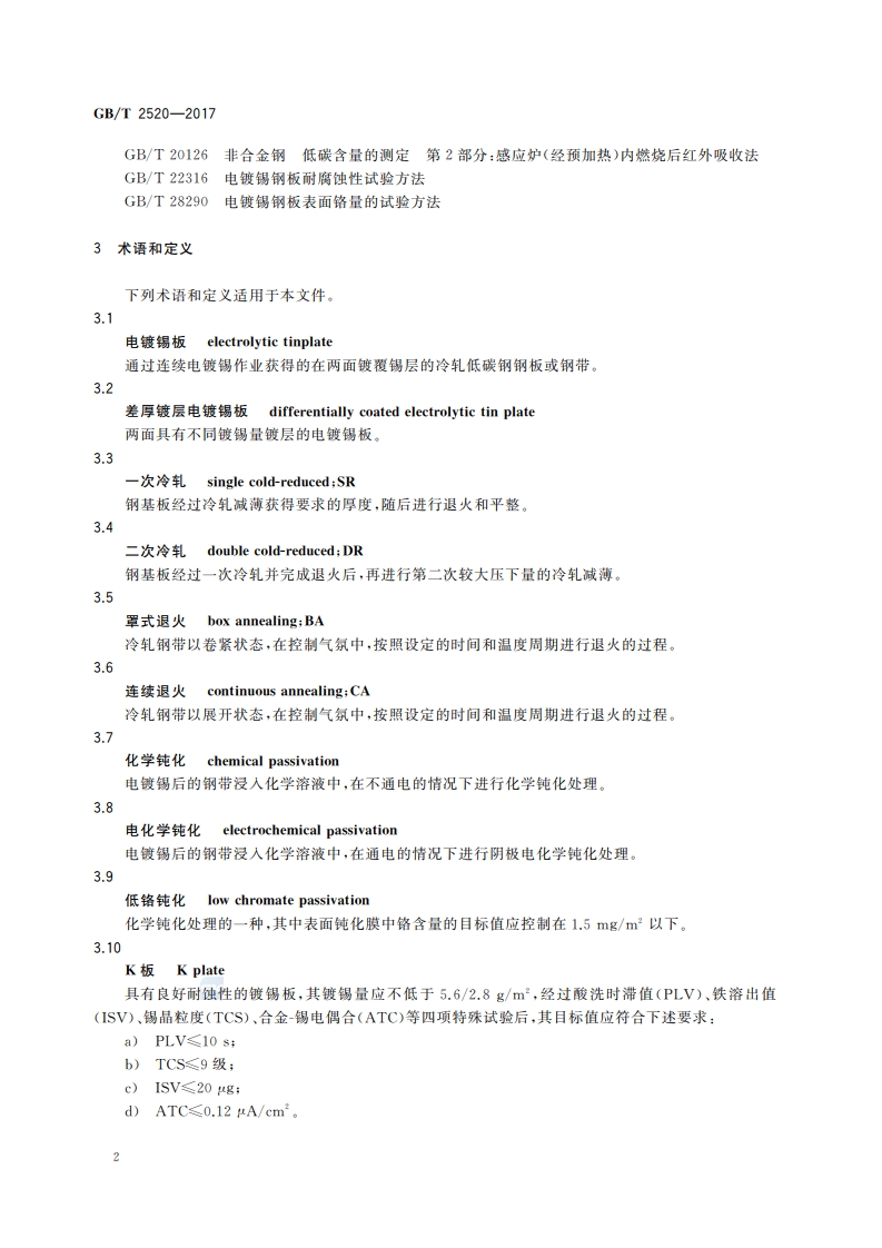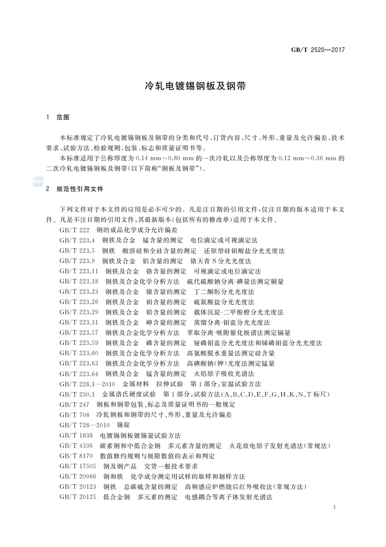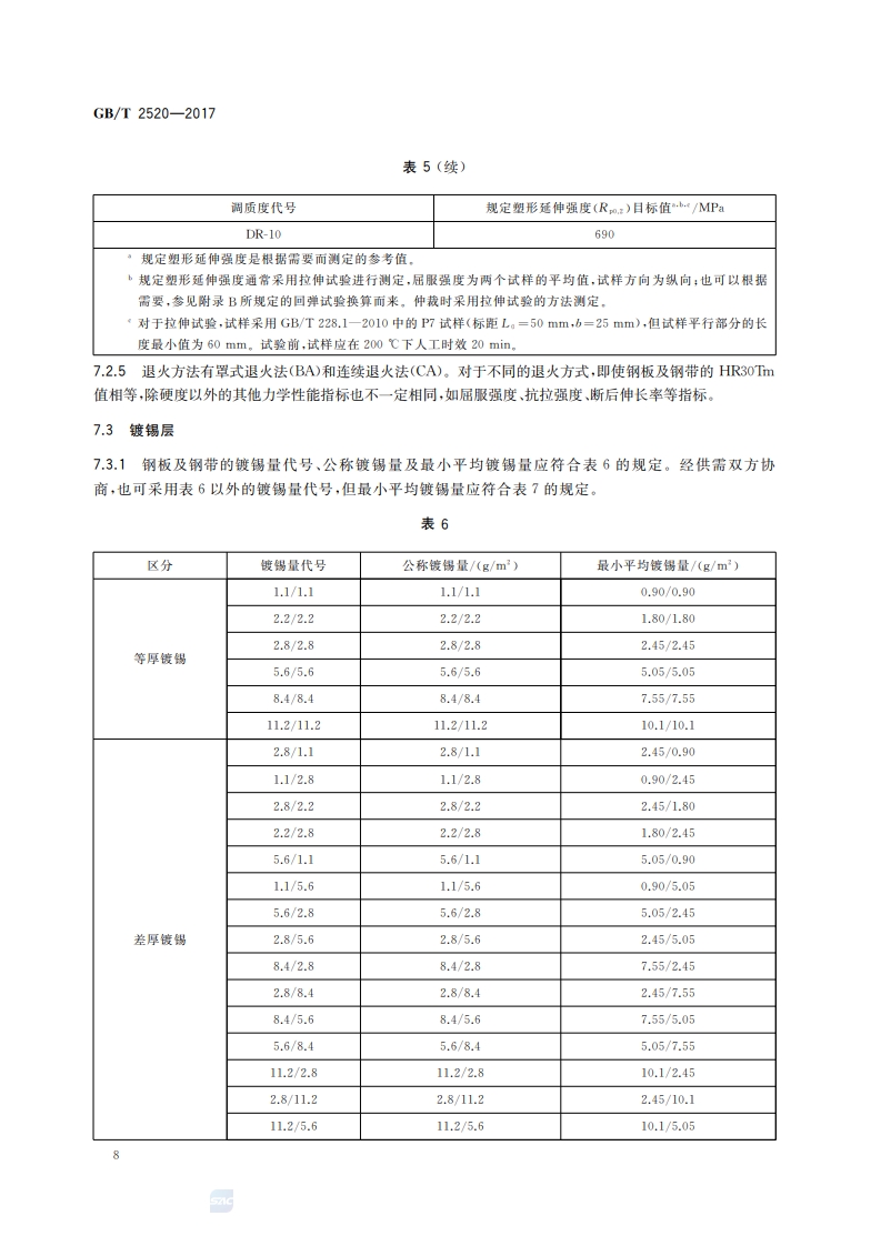 国标GB/T2520-2017,冷轧电镀锡钢板及钢带